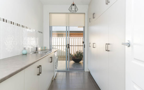 The laundry boasts plenty of storage with a bench top the full length of the room, plus built in cupboards. The area at the side of the home out from the laundry is large enough for a sitting area to read the morning paper while enjoying a coffee in the sunshine.